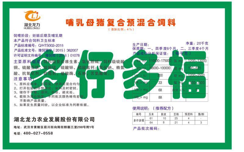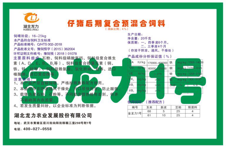 湖北龍力農業發(fā)展股份有限公司坐落于武漢市黃陂區前川街向陽街群順三里298號附1號。公司成立于2014年6月,公司自成立以來把“創(chuàng)全球最大養豬綜合服務”為企業愿景。致力于打造教保料品牌”作為公司發(fā)展的明確目標。公司一直致力于豬營養的研究和開發(fā),積極與國內外高校和科研機構合作,推廣養豬技術、動物營養新概念,向世界農牧企業學習與合作。公司采用國內先進的生產工藝,選擇高精度電子配料秤,高均勻度、無殘留混合機等先進設備....